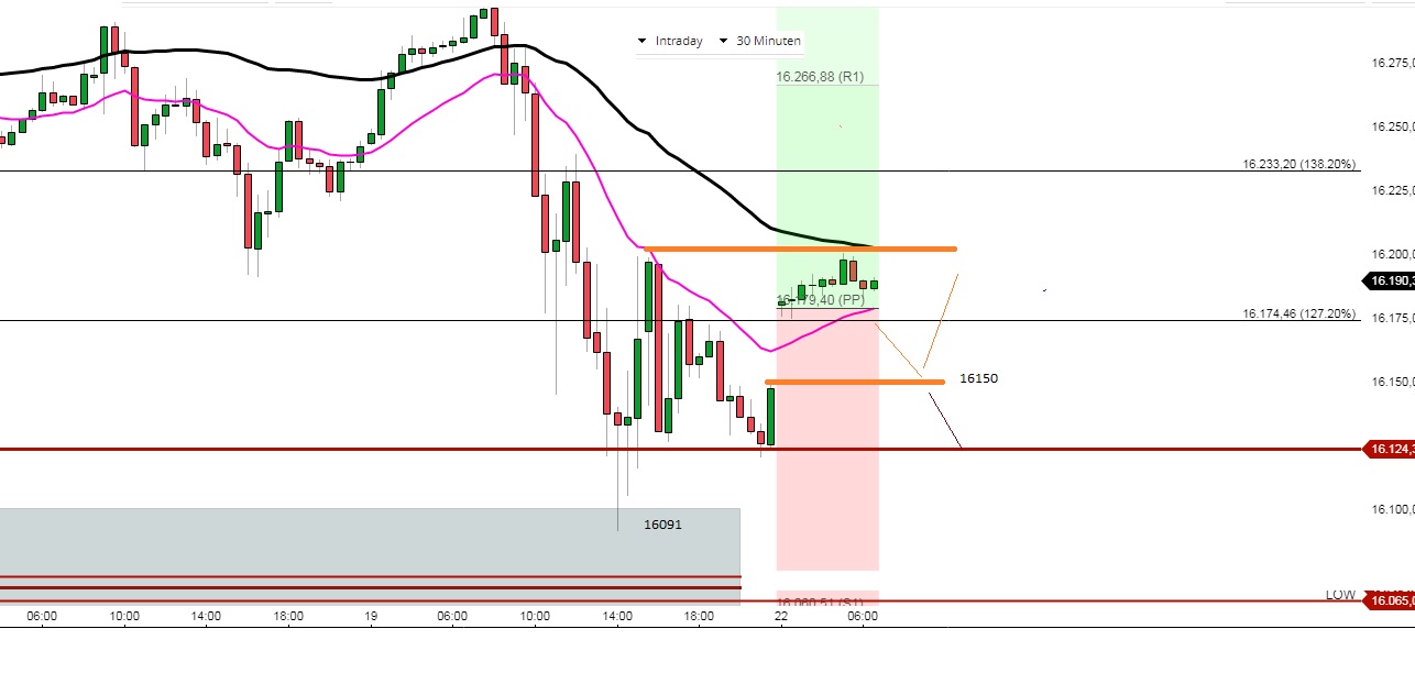 ( Intraday) Ein erstes Indiz für einen Entry würde der Bruch von 16175 geben. Das Ziel rein nach CT sind 16150 + 16124.